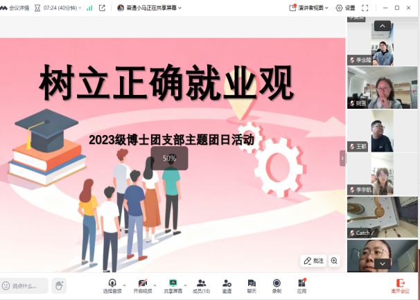 博士团支部各团支书结合当前就业市场的多元变化,剖析了“盲目追求稳定”“对新兴职业认知不足”等就业误区,阐明“适合自己的才是最好的,拼搏奋斗方能成就精彩”的就业理念。团支部发起“拒绝躺平,主动成长”倡议,鼓励团员以“日积跬步”的坚持积累职业技能,在实践中明确方向、实现价值。