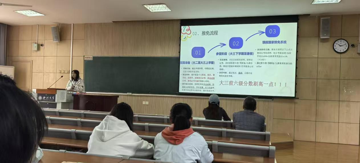 张佳郁同学细致介绍了推免系统的填报流程、关键时间节点与注意事项,并提醒同学们注意协调校内推免资格审核与校外夏令营参与的时间安排。她以药物化学等专业课为例,强调了课堂听讲与重点把握的重要性,建议同学们提前准备多版本申请材料,广泛投递,并勇于尝试跨学科方向。