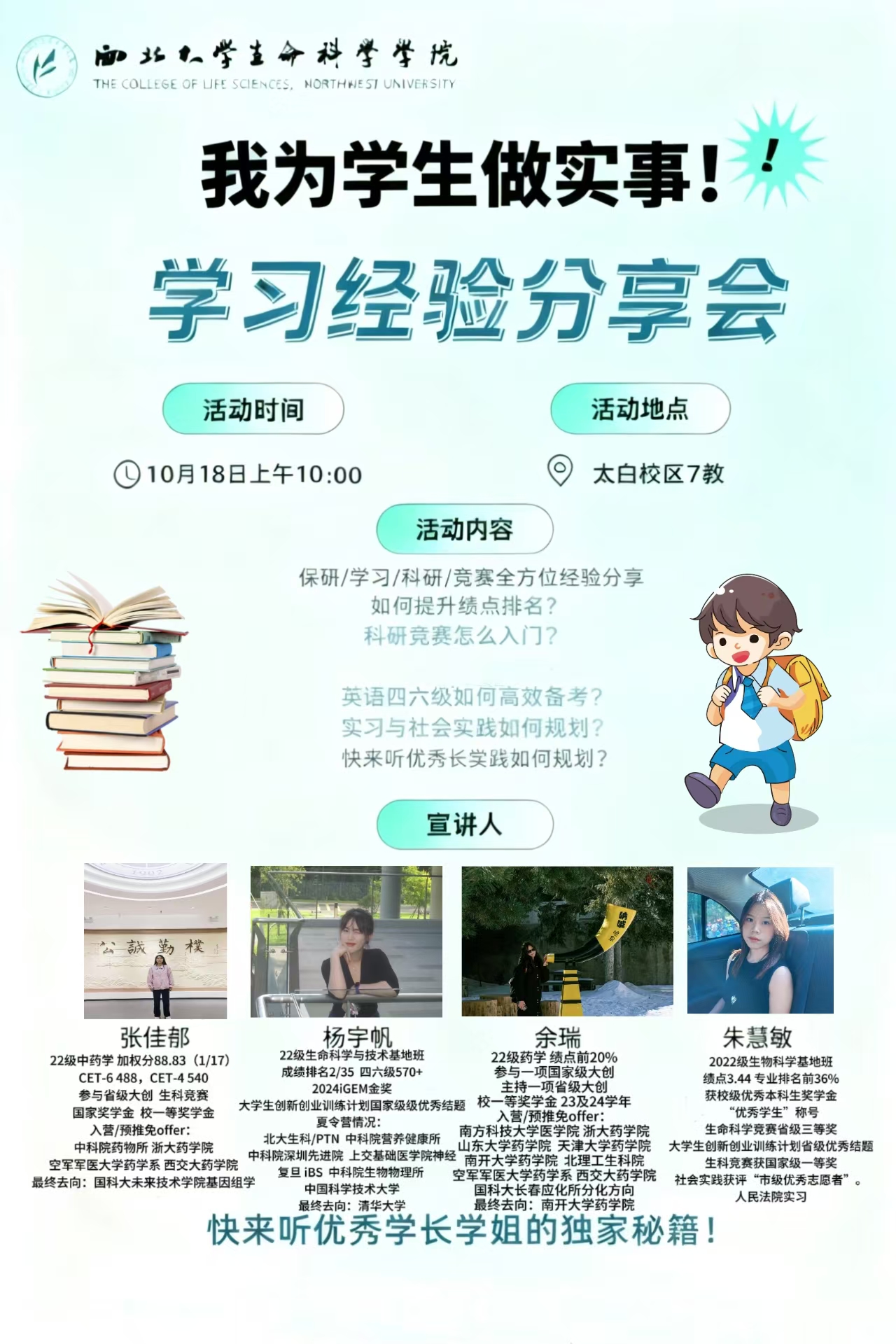 为深化学风建设,帮助学生明确学业发展方向,10月18日,学院团委在太白校区7307教室成功举办本科学习经验分享会。活动特邀我院2022级4名优秀学生代表担任嘉宾,他们已成功保研至清华大学等知名高校,为2024级本科同学带来了一场内容详实、氛围热烈的经验交流盛宴。分享会由2024级本科生班主任吴少平教授主持。
