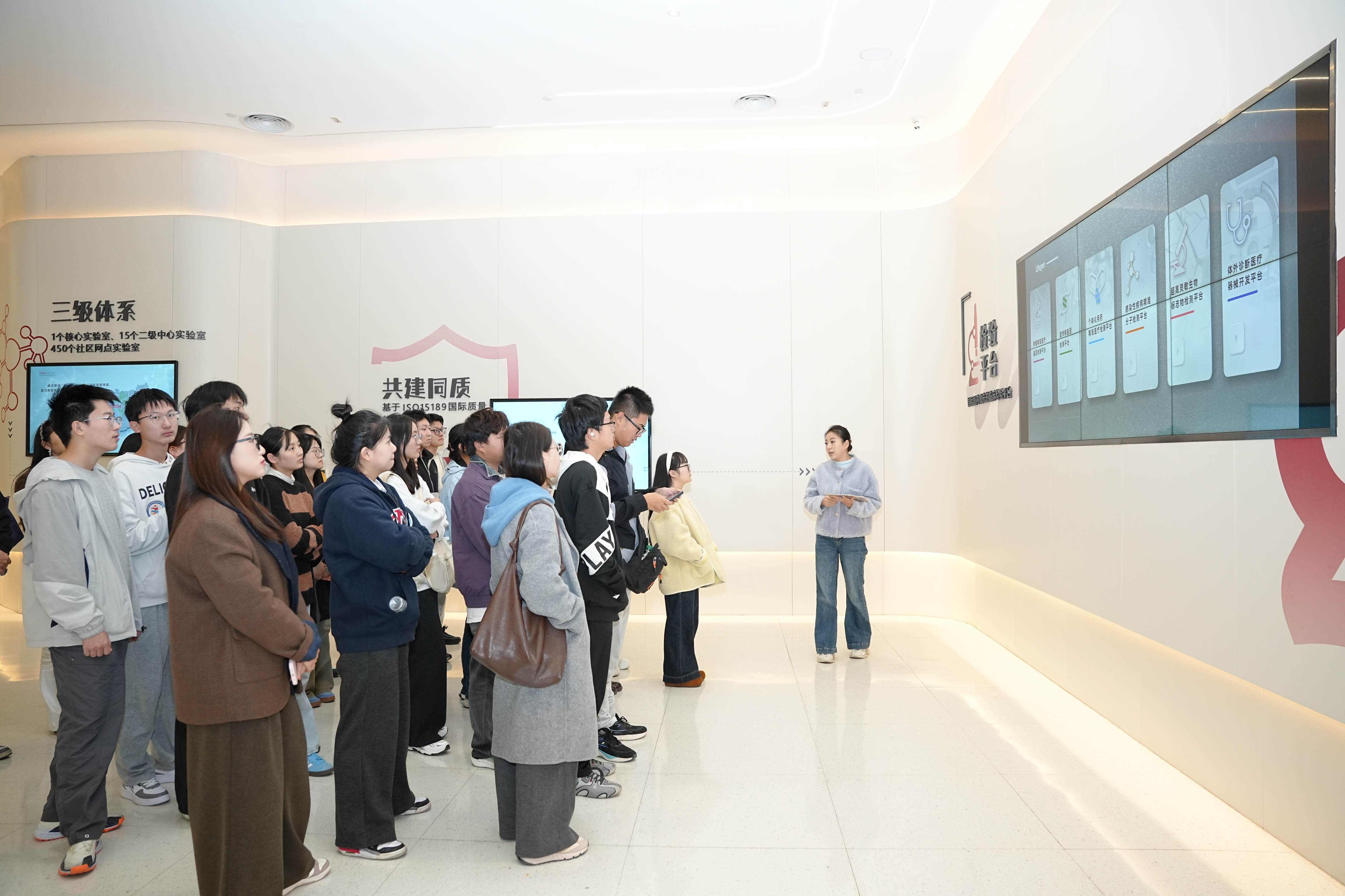 当日下午,团队前往陕西佰美基因股份有限公司。在讲解员的带领下,同学们走进佰美基因一楼科技展厅,展厅通过图文展板、实物模型、数字大屏、VR 体验等多种形式,全面展示了企业的发展历程、核心团队、技术专利、产品体系及行业影响力。之后同学们走进西安医检核心实验室,这是国内先进的智慧化医学检验平台,涵盖了临床检验、微生物及药敏检测、临床分子检测等多个领域,在此近距离观察了科研人员和医学检验人员的日常工作,了解了样本处理、检测分析、结果解读等关键环节的操作规范,进一步加深了对医学检验行业的认知。互动交流环节,佰美人力资源部HR与同学们深入探讨了专业应用与职业发展路径,帮助同学们更加明确专业与行业的结合点。