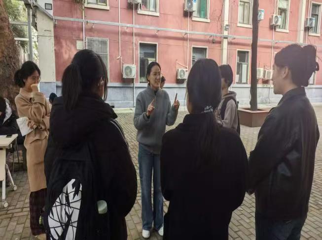 现场氛围一开始便被“物种盲盒”的未知与期待点燃,同学们随机组队,4-5人一组迅速集结,在5分钟的头脑风暴里,大家从陌生到熟络,从各自发散到默契凝聚。有的小组围着“蜜蜂”卡片激烈讨论:如何用肢体复刻“8字舞”的精准轨迹,怎样通过动作传递“蜜源信号”;有的小组为“章鱼”的触手联动绞尽脑汁,有人负责模拟主腕的灵活掌控,有人配合展现副腕的协同摆动;还有的小组挑战“DNA双螺旋”的立体结构,成员们弯腰、扭转、衔接,在一次次调整中还原螺旋的缠绕与对称;而“含羞草”组的同学们则精准捕捉叶片触碰后“害羞蜷缩”的瞬间,肢体的轻柔联动引得现场阵阵喝彩。从微观的分子结构到宏观的物种习性,同学们带着天马行空的脑洞,将专业知识转化为生动的肢体语言,每一个动作都藏着对生物特性的精准解读,每一组表演都充满了创意与巧思。