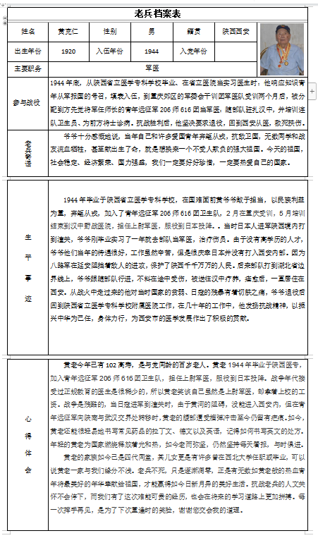 1944年毕业于陕西省立医学专科学校,在国难面前黄爷爷敢于担当,以民族利益为重,弃笔从戎,加入了青年远征军206师616团卫生队。当时日本人入侵陕西潼关,爷爷刚毕业实习了一年就去部队当军医,治疗伤员。如今,老人家中已是四代同堂,黄老儿女更是有许多曾在永利集团任职或毕业,可以说黄老一家与西大缘分不浅。