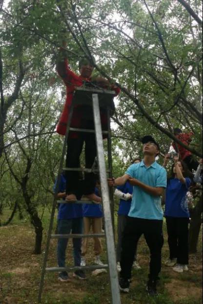 巴旦木也正值采摘的季节,同学们也参与到当地农户的采摘过程中,亲身体验了巴旦木的采摘。在巴旦木的果园里,同学们发现接近六旬的老人攀爬树枝或者蹬踩扶梯采摘果实,由于机械化大规模种植和采摘在当地难以推行,每到这个时候这些果农就只能以人工的方式采摘果实。当地年轻的劳动力都前往到大城市,而村庄里的劳动力大多为老人。