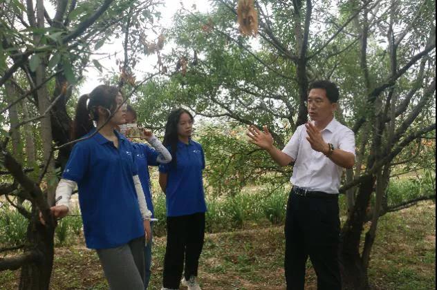 参观完蟠桃和毛桃的种植基地后,同学们前往了巴旦木的种植基地。何胜军总经理给同学们介绍说这边的巴旦木种植都是通过嫁接来完成的,将巴旦木的枝条嫁接到桃树上。与此同时,同学们还发现桃树的树干上结有许多的桃胶,根据和胜军总经理介绍,桃胶中含有很多胶原蛋白,但是没有做过专业的营养成分和功能检测,不知道是否具有市场价值。同学们采集了一袋树胶,希望回校之后能够结合自己的专业知识在实验室里做初步的实验研究。