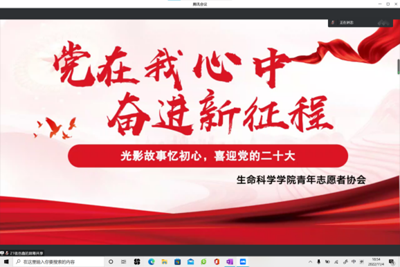 为深入学习贯彻党的二十大精神,涵养生科学子深沉炙热的家国情怀,坚定生科学子爱国爱党的信念。11月4日晚,学院学生青年志工部以线上的形式开展了“光影故事忆初心,青春献礼二十大”主题观影活动,100余名团员青年们积极参加。