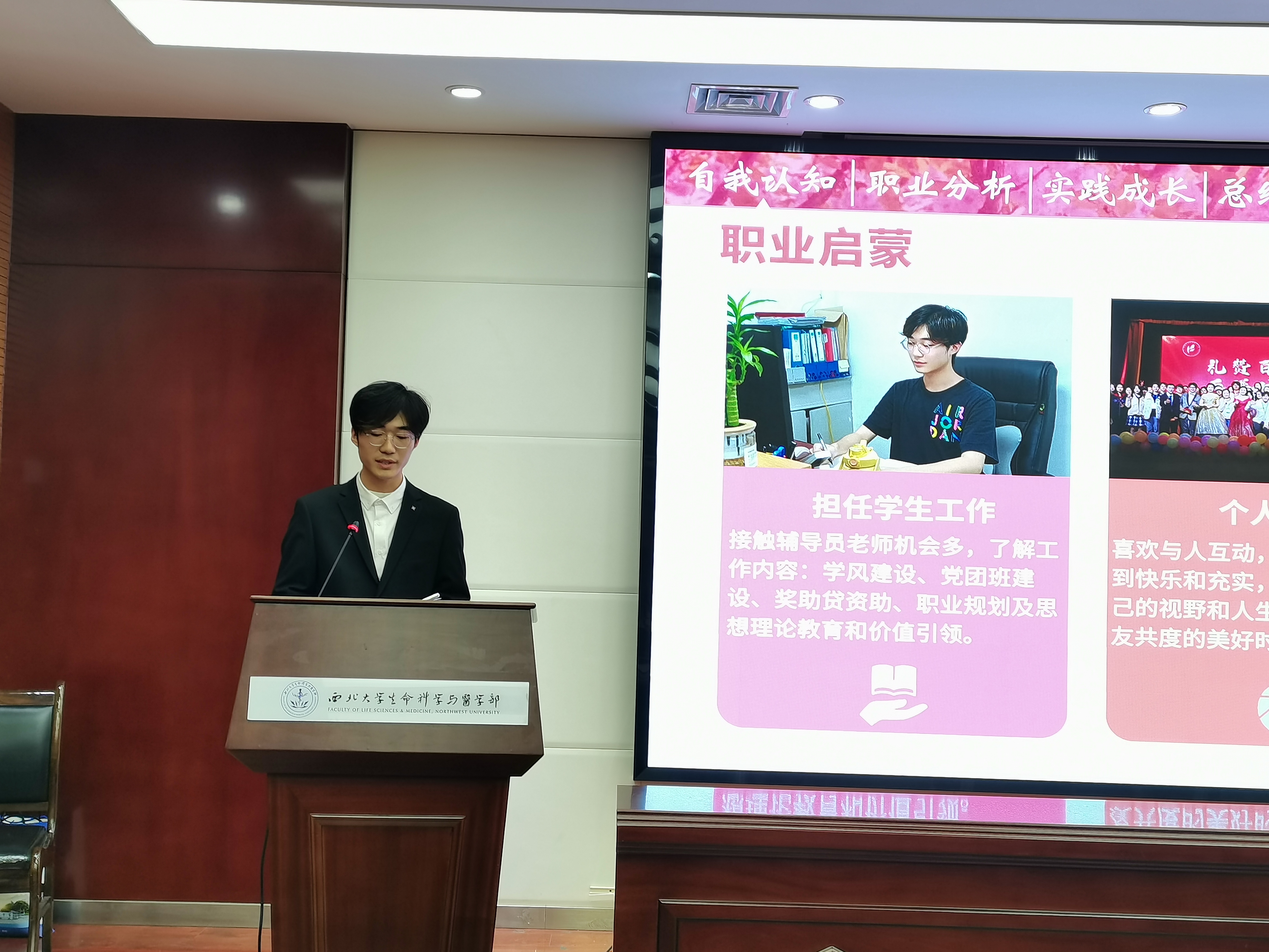 决赛正式开始之前,每场的评委老师代表首先向大家介绍了本次学院大赛的赛程概况,强调了决赛的形式、时间要求与评审标准等,鼓励同学们尽情发挥,赛出风采,赛出水平。决赛分为选手主题陈述与评委提问点评两部分组成,成长赛道主要考察参赛学生生涯发展报告与现场展示,就业赛道主要考察学生求职简历、辅助证明与现场展示。主题陈述环节,参赛学生逐一通过PPT的形式,结合所学专业与自身实际,成长赛道选手围绕职业认知、自我认知、学习实践行动、评估与调整等方面展示了各自的生涯发展规划,就业赛道选手针对职业要求、岗位胜任力、发展潜力等详细介绍了个人求职意向和职业准备情况。选手们自信大方、青春热情、思路清晰、陈述流畅,充分展现出了青年学生追梦、逐梦的奋斗历程和新时代的青年担当。