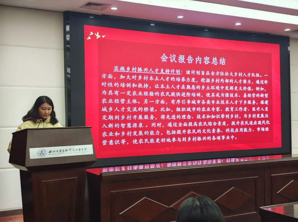最后,学院团委副书记范铭沁老师在总结中强调,中央一号文件为我们指明了方向,作为新时代的大学生,尤其是生科学子,要勇于担当,积极投身到乡村振兴的伟大事业中去。她鼓励大家要将学习成果转化为实际行动,推动学院学生工作不断创新,为学校和社会的发展贡献力量。