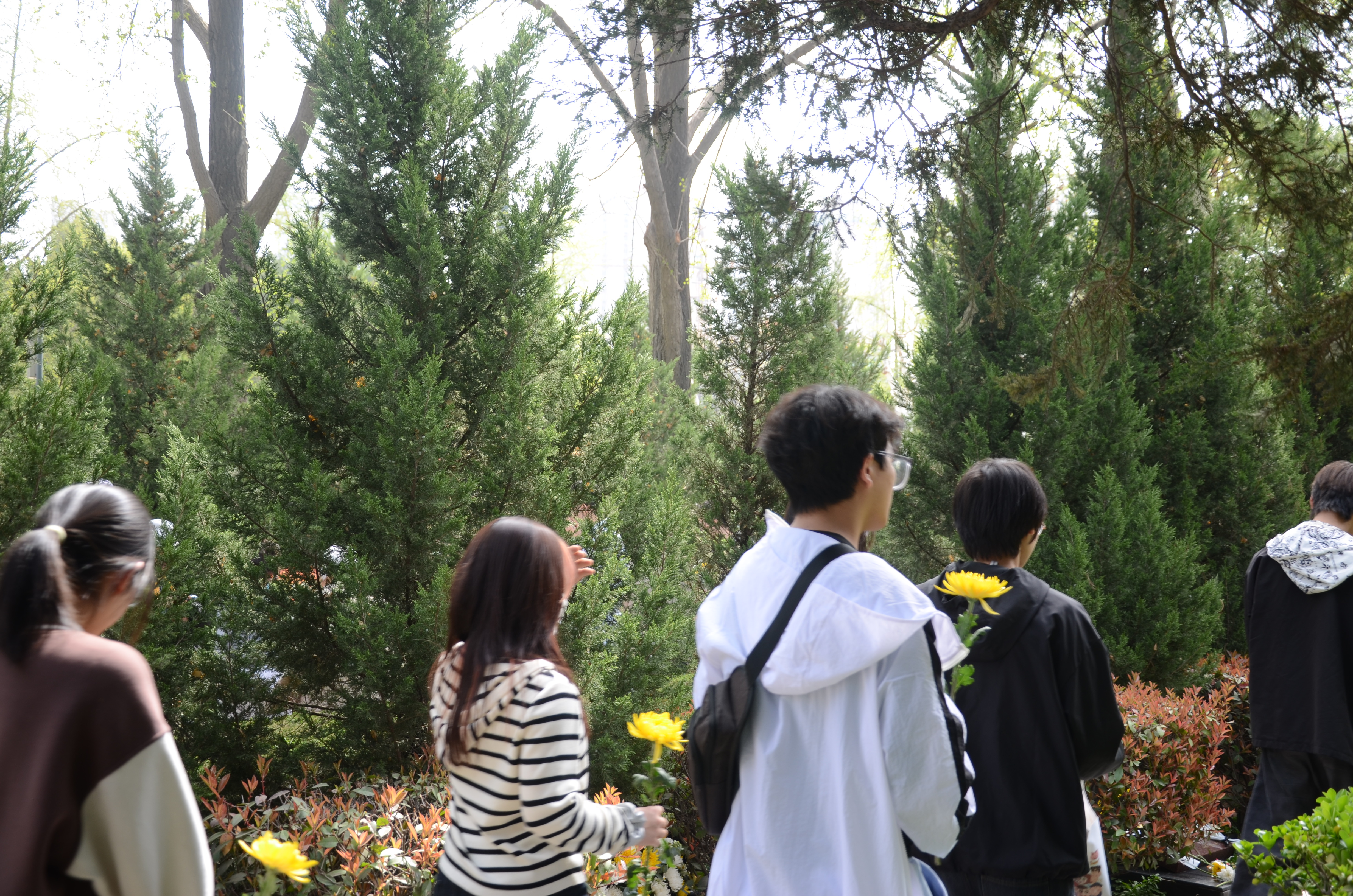 金辉熔淬青松魄,碧血凝成万古春。同学们手持菊花,怀着无比崇敬的心情,缓步踏入这片英雄长眠之地。在烈士纪念碑前,全体学子肃立默哀,以无声的誓言表达对先烈们的深切追思。风过松涛,仿佛在诉说着那段峥嵘岁月,更激荡起每个人心中澎湃的爱国之情。