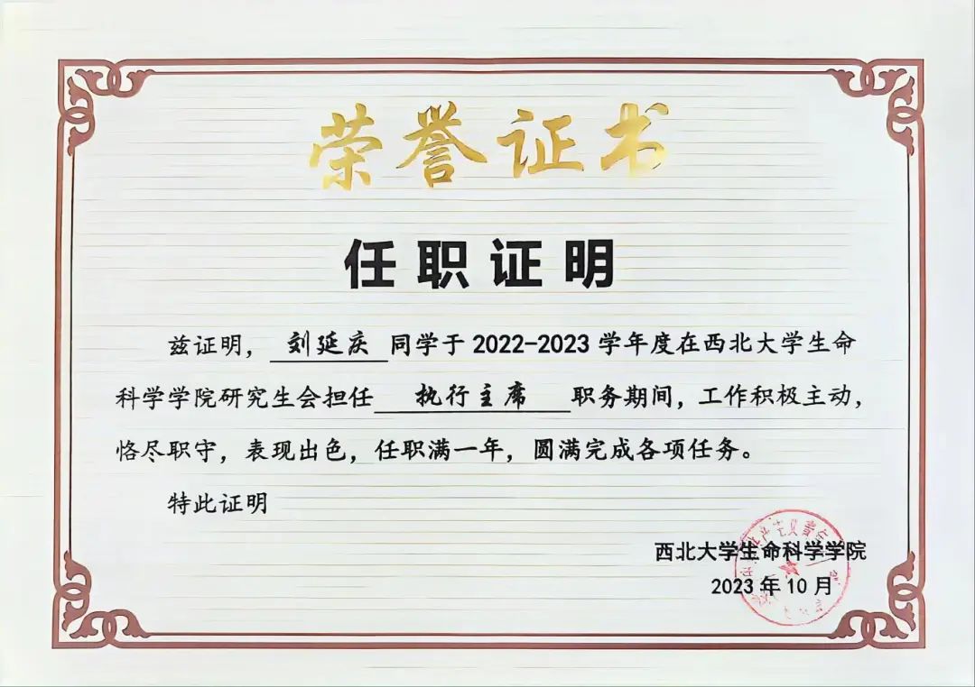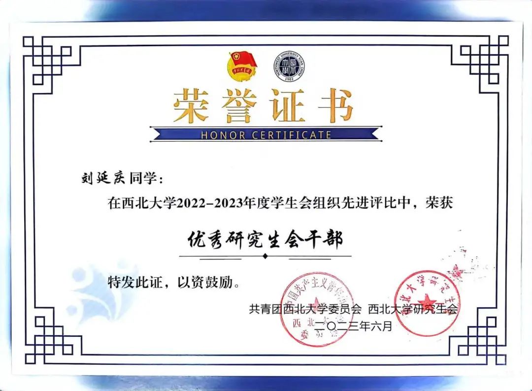 在研究生期间刘延庆尝试参与了学生工作。他曾担任2021硕士第五团支部书记,yl9193永利集团研究生会执行主席。在担任团支书期间,刘延庆在团委的刘凌飞老师帮助下学着处理相关事宜,在工作中提升自己的能力。在担任主席期间,他曾在yl9193永利集团团委张芝榕老师和郭佳惠老师的带领下统筹日常学术讲座、木香学术沙龙、青年学者讲坛、学术活动月、实验室安全文化月各项活动共计83场,活动反响良好。yl9193永利集团研究生会荣获2023年度永利集团标兵研究生分会。