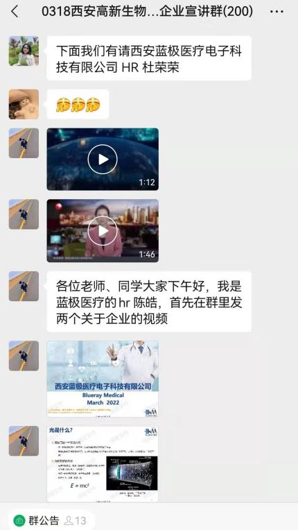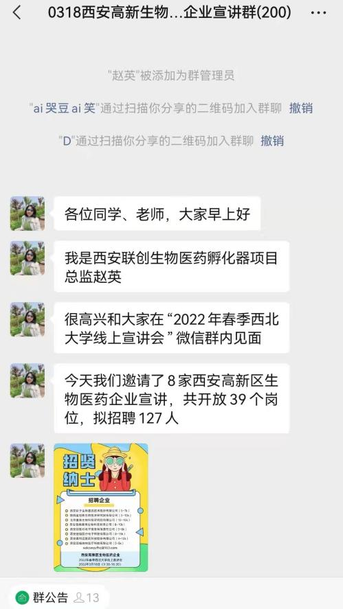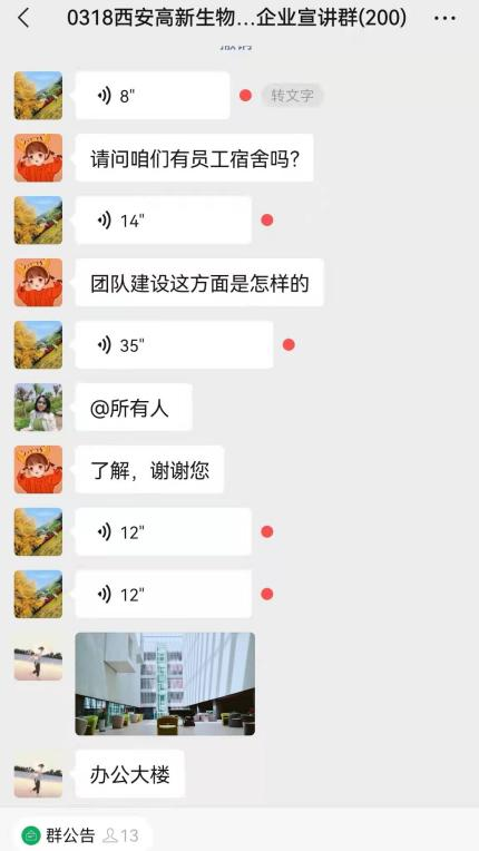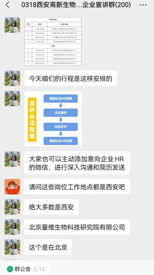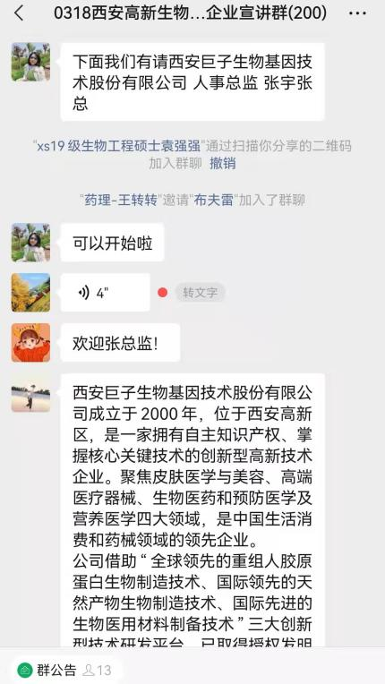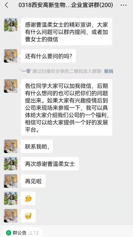 此次专场招聘会作为疫情防控形势下的一次大胆实践,前期通过毕业生就业需求广泛调研,积极联系西安联创并充分交流,利用线上渠道大力宣传,共计邀请了西安高新区8家优质生物医药企业参会,提供覆盖生物工程、细胞生物学、动物学、生物化学与分子生物学、中药学等若干学科对口岗位39个,拟招聘人员127人,充分满足了我院生物类、中药类学生的求职需求。宣讲群内采用各企业负责人分时段入群,首先介绍公司简况、工作内容、岗位需求以及招聘相关事宜,随后毕业生与企业问答互动的方式进行,毕业生们根据个人诉求积极提问,深入了解了职位信息、企业文化、福利待遇等问题。