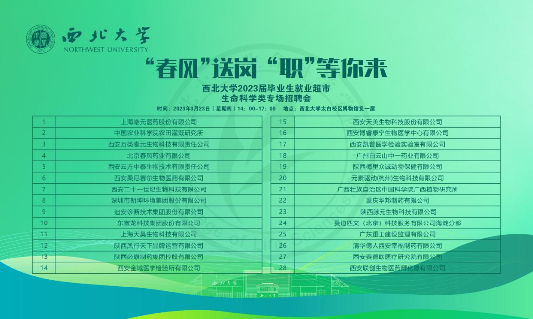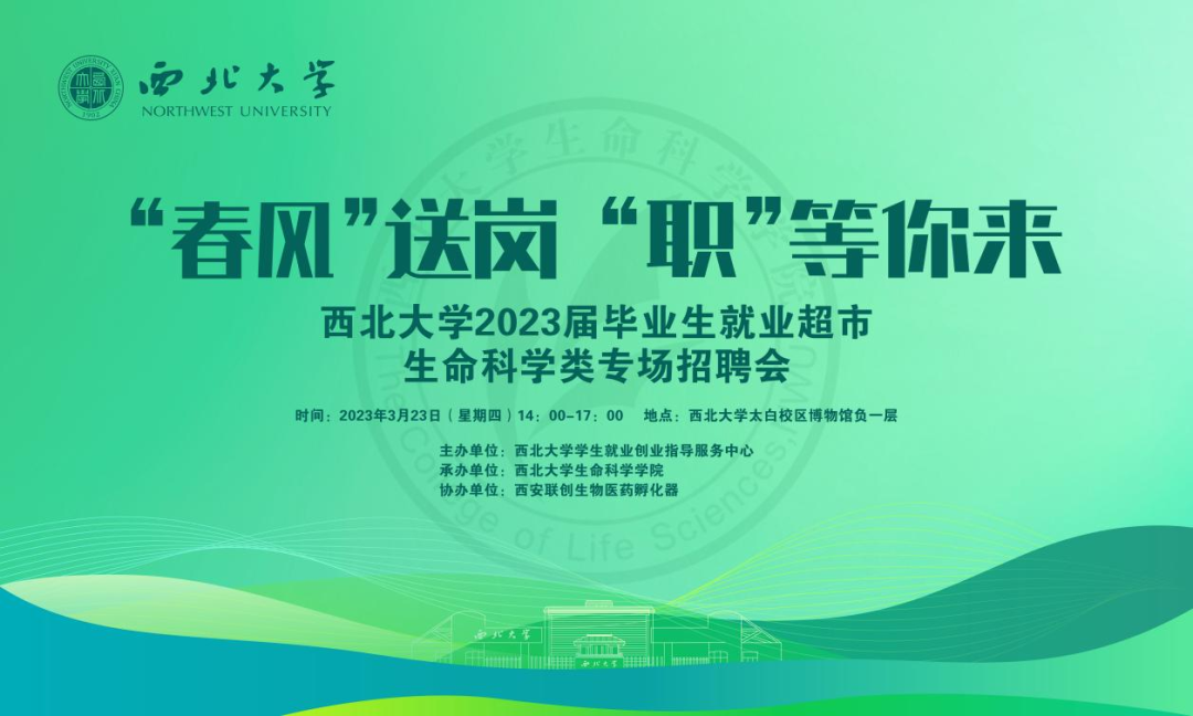 为深入贯彻落实党中央、国务院“稳就业”“保就业”决策部署,进一步推进2023届毕业生就业创业工作,更好搭建用人单位与毕业生高效供需平台,促进毕业生更充分更高质量就业,3月23日下午,由校学生就业创业指导服务中心主办,我院承办,西安联创生物医药孵化器协办的2023届毕业生就业超市——生命科学类春季专场招聘会在太白校区博物馆如期举办。校党委常委、副校长,学部主任陈富林出席并走访参会单位,学生工作部部长寇嘉、校就创中心副主任米鑫、我院党委负责人张宇、院长付爱根、学生工作负责人魏宁、就业专干、全体学工干部陪同走访。我校2023届百余名毕业生,西北农林科技大学yl9193永利集团等兄弟院校毕业生参加招聘会。