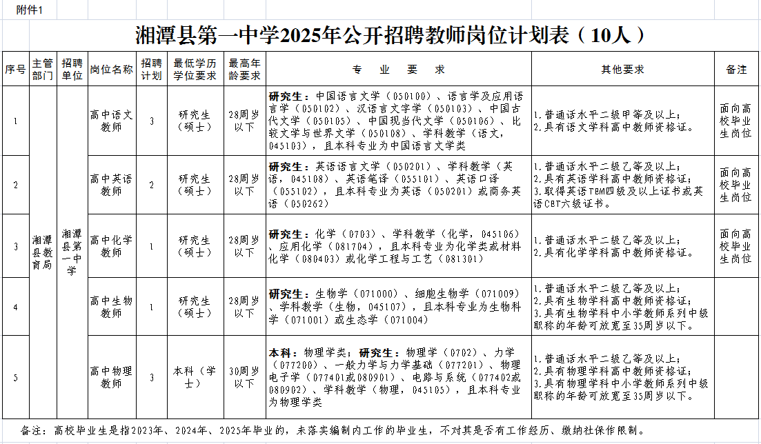 (五)应届毕业生包括2025年毕业及择业期内(2023、2024年毕业)未落实工作单位毕业生(未签订劳动合同、未缴纳社会保险)。2025年届毕业生可先行报名及考试,经考试、体检、考察、公示,并于2025年7月31日之前取得毕业证书、学位证书、对应学科高中教师资格证书的,可按规定聘用,否则不予聘用。