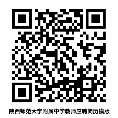 3.进入“笔试及心理测试”环节,参加者需提供个人纸质版简历1份(扫描下方二维码获取个人简历模板:陕西师范大学附属中学教师应聘简历模板,未使用简历模板视为简历不合格),纸质版简历请以“陕西师范大学附属中学教师应聘简历、身份证复印件、教师资格证书复印件、学历证书复印件、学位证书复印件、获奖证书复印件和简历中提及的可以证明本人能力水平的相关材料复印件”顺序装订成册。