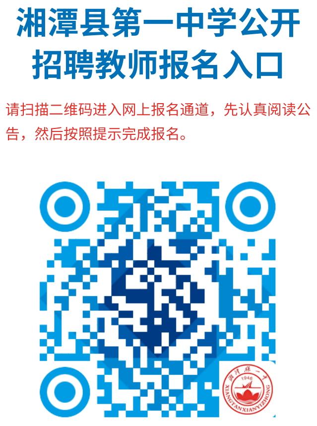 (一)报名 1.报名时间:2025年2月24日9:00至2025年3月 10日17:00。 2.报名方式:采取网上报名方式。在报名时间内应聘人员登录湘潭县第一中学校园网(http://www.xtxyz.com)或“湘潭县第一中学”微信公众号,扫描“湘潭县第一中学2025年公开招聘教师报名二维码”,下载并填报《湘潭县第一中学2025年公开招聘教师报名登记表》(详见附件3,以下简称“《报名登记表》”),上传资料完成报名,不接受其他形式报名。