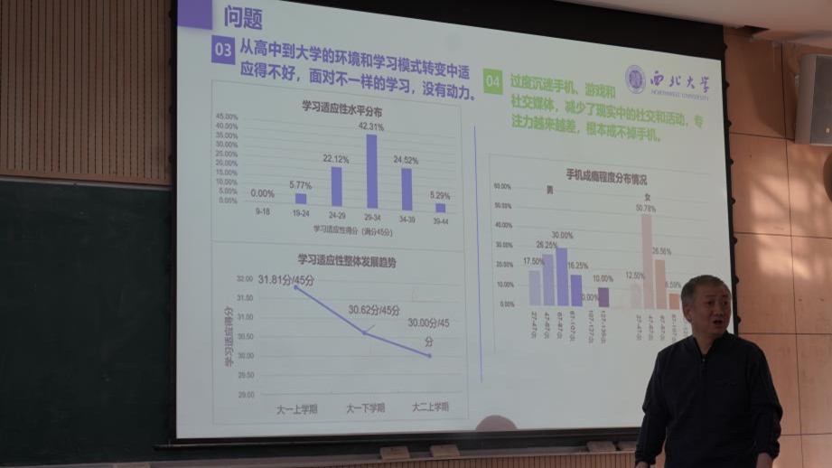 讲座伊始,一组关于学院2024级本科生学习适应水平的分布数据,将当下学生们的学习现状清晰呈现。数据背后,折射出的是不少同学共同的困惑:学习动力不足,仿佛一艘失去引擎的航船,在知识的海洋里徘徊不前;超三分之二的同学坦言背负着不小的学习压力,从高中到大学的学习模式转变,课程难度的逐步提升,让学习的艰难程度与日俱增。这份迷茫,像是一层薄雾,笼罩着许多渴望进步却又不知从何发力的新生,也让本次讲座的意义愈发凸显。