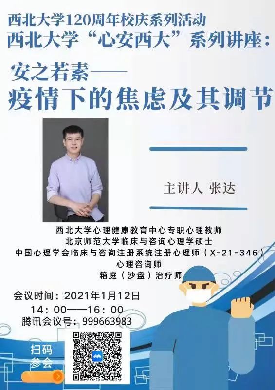为缓解疫情焦虑,呵护心理健康,1月12日,学院特邀校心理健康教育中心专职心理教师张达老师作“安之若素——疫情下的焦虑及其调节”线上主题报告,学院辅导员刘凌飞老师及全体学生共同参加。