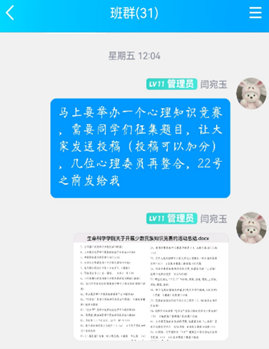 “与心灵相约,与快乐相伴”,按照学校第七届心理健康科普知识大赛相关要求,学院以心理协会为依托,以各班级心理委员为抓手,以《心理健康手册》为主线,面向全院本科生征集心理健康常识题库,与心理自助方式方法,提高大学生心理健康水平。