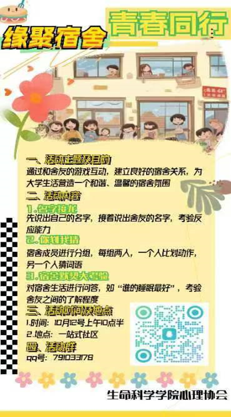 为了帮助新生建立和谐的宿舍关系,掌握正确的人际交往技巧,迅速适应校园新环境,10月12日,学院心协在学校太白校区一站式社区举办了“缘聚宿舍,青春同行”宿舍破冰大赛,帮助同学们增强团队合作意识,培养交往沟通能力,营造和谐、温馨的宿舍氛围。
