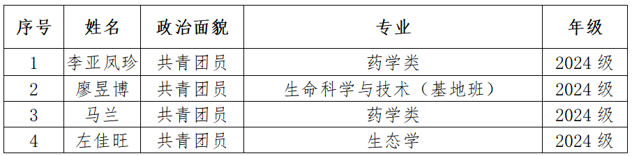 根据学校《关于在我校开展2024—2025年度希望工程“Coach基金会·驰梦而行”大学生资助项目评选工作的通知》的工作要求,经过学生申请、班级推荐和学院学生工作领导小组评定,拟推荐我院2024级药学类李亚凤珍等4人为2024-2025年度“Coach基金会·驰梦而行”助学金获得者。公示信息如下: