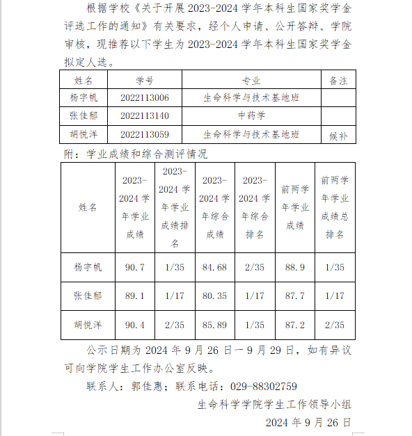yl9193永利集团2023-2024学年本科生 国家奖学金拟推荐名单公示