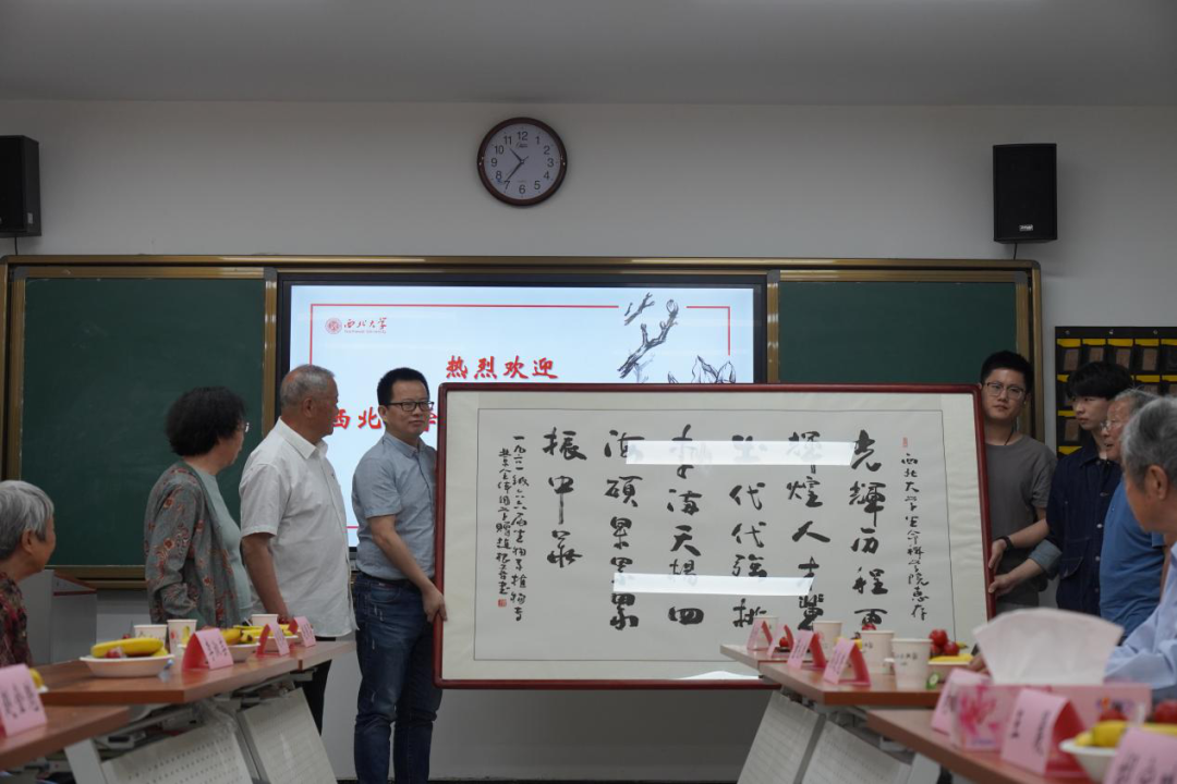 座谈结束后,校友们向学院赠送了由他们精心挑选、制作的字画并合影留念,表达了对母校的深厚感情,祝愿学校、学院蓬勃发展。学院向校友们赠送了蓝田玉印章和《西大百年历史》书籍,感谢校友们多年来对母校的牵挂和关注。