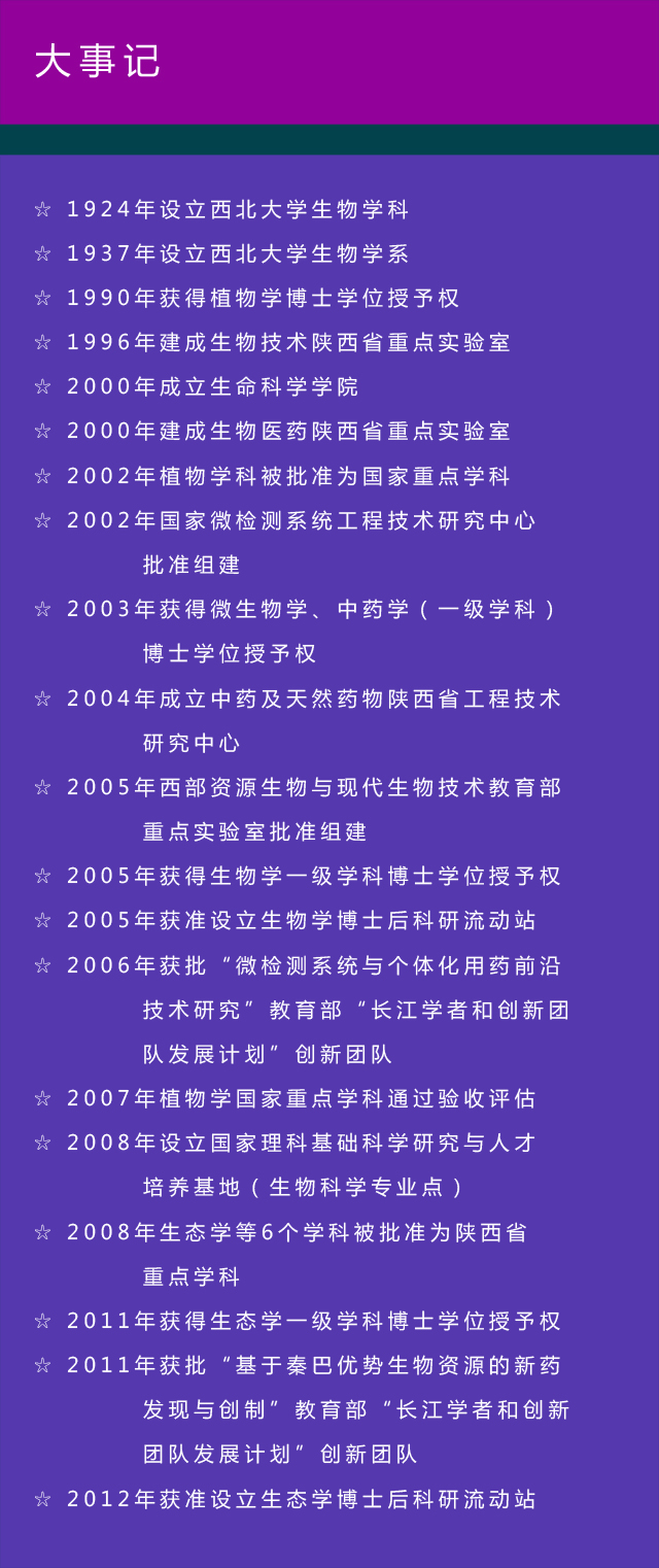 学院设有国家生命科学与技术人才培养基地(生物技术和生物医药专业点)、国家理科基础科学研究与人才培养基地(生物科学专业点)两个国家人才培养基地;设有生物技术、生物科学、中药学、生态学、药学5个本科专业,其中生物科学、生物技术专业2003年被评为陕西省名牌专业,生物科学专业2010年被评为省级特色专业,2019年被评为国家级“一流本科专业”,中药学专业2008年被评为省级和国家级特色专业。学院拥有生物学、中药学和生态学三个一级学科博士学位授予权和生物学、中药学、生态学三个博士后科研流动站,博士、硕士学位授权点涵盖生物学、中药学和生态学所有二级学科;学院设有植物学国家级重点学科、国家工程技术研究中心、教育部重点实验室各1个,省级重点实验室和工程技术研究中心6个,设有植物研究所、生态毒理研究所、现代生物技术研究所、人口与健康研究所、秦岭生物多样性研究中心、中美生态合作研究中心、糖生物学与糖工程研究中心、组织工程实验室、陕西省“四主体一联合”平台——生命健康研究院等研发机构;还有永利集团-美国百健艾迪社区实验室、国家级生命科学与技术实验教学中心、动植物标本室、图书资料室、多媒体教室,以及20多个各类基础和专业实验室等,具备良好的教学科研条件,是西北地区培养生命科学与技术高层次人才的重要基地。