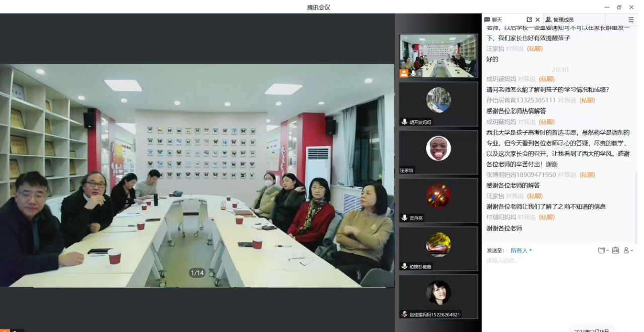 会议伊始,辅导员任洁老师介绍了班级建设、课程与考试安排、奖助学金政策、学生参与活动及获奖情况,表扬肯定了同学们的付出与成长。随后,张亚妮副院长介绍了完全学分制、转专业、实习政策等人才培养方案。紧接着,药学班两位班主任依次介绍班内学生情况。乔博灵教授指出了学生前期迷茫不安的心理特点,提醒家长们常与学生们沟通,多给予情感支持,帮助学生们明确学习目标,调整状态砥砺前行。曹艳君副教授主要介绍了班级活动的开展情况及班会成效,并表示在未来会多与学生谈心谈话,调研学生问题,解答同学困惑。之后,房敏峰教授从药学专业分流角度介绍了药学与中药学在理论、课程培养、考研院校及就业情况的区别,使家长进一步了解学生将来专业分流情况。王静老师提醒各位家长建议同学们不要拘泥于课本,尽早进入实验室,亲身实践、主动探索,研究药物其根本。随后,魏宁副书记向家长们介绍了学院的教授班主任制度、学业导师制度,并就学生“教育、管理、帮助、扶持”方面,向家长提出四点建议——多鼓励学生积极学习,提前做好学业规划;多教育学生遵守法律法规、校纪校规,构建安全、稳定、健康、和谐的校园环境;多关心学生身心健康,助力学生幸福成长;多及时与学生、学校交流沟通,持续完善家校双向交流沟通机制,形成家校合力,共育优秀人才。