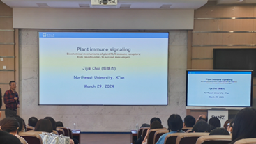 讲座伊始,柴继杰教授运用丰富的图片和视频资料,生动地展现了植物学的魅力。他详细讲解了植物免疫机制的研究,深入剖析了植物如何通过复杂的免疫系统抵御病毒、细菌等外部侵害。同时,柴教授还介绍了植物在面临不同环境压力时,如何巧妙地调动自身防御机制以确保生长繁殖的正常进行。这些理论横跨植物学、生态学、生物学等多个领域,不仅让学生们对植物免疫机制有了更深入的了解,也激发了他们对生命科学研究的浓厚兴趣。