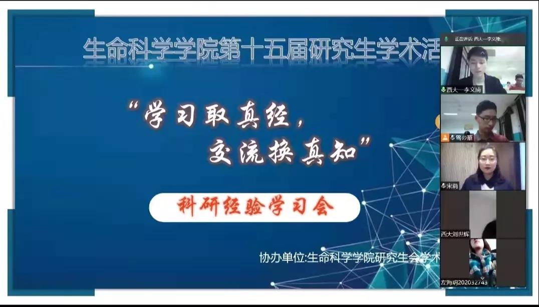 10月31日,为进一步激发我院研究生的学习及科研热情,帮助研究生新生顺利开展科研工作,加强研究生之间的沟通交流,我院特联合西北工业大学、西安交通大学、陕西师范大学、西北农林科技大学4所兄弟高校举办“学习取真经,交流换真知”科研经验学习会。学习会于线上举办,各年级研究生100余人参加此次活动。