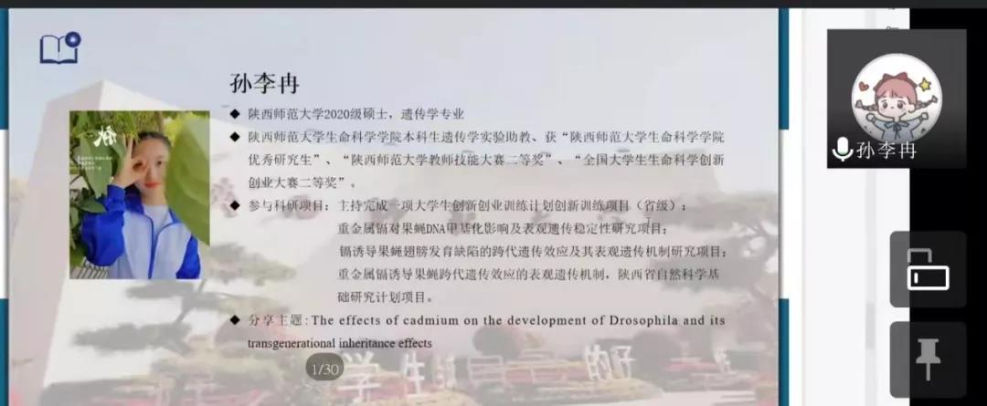 随后,宋莉就“T6SS-3分泌的microcin核酸酶Tce1非接触依赖杀菌功能的研究”课题为大家讲述了有关细菌的专业知识。于海洋从个人简介、科研素养、学生工作三方面为大家分享了自己在研究生阶段学习的心得体会,并给出实验前要写计划、实验后要做记录等实践性建议。左卓为大家讲解了有关关节炎治疗的研究方法及成果。周通给大家分享了关于武当木兰的相关性研究。最后孙李冉就“镉诱导果蝇发育缺陷的跨代遗传效应及其表观遗传机制研究”这一课题,跟大家探讨了其研究背景和研究内容。