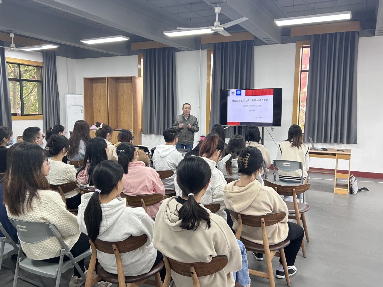 他向同学们讲解了学业压力的主要来源和心理表现,指出高强度的课业、高度竞争、导学关系及成果发表压力等,都可能导致同学们出现焦虑、抑郁情绪,或者陷入自我怀疑的状态。由此鼓励同学们,一是要提前熟悉毕业要求,明确目标,制定详细计划;二是要做好时间管理,制定优先级,提高效率;三是要积极寻求学术支持,借鉴前人研究;四是要理性看待并虚心接受批评,将其视为成长的机会;五是要学会通过积极沟通、体育锻炼来进行情绪宣泄与调节。