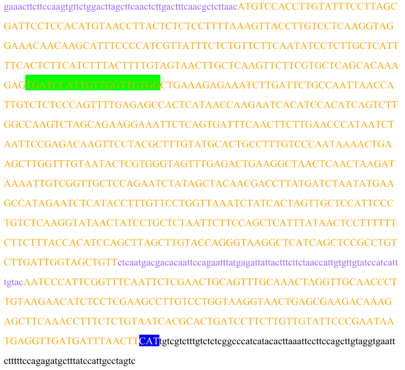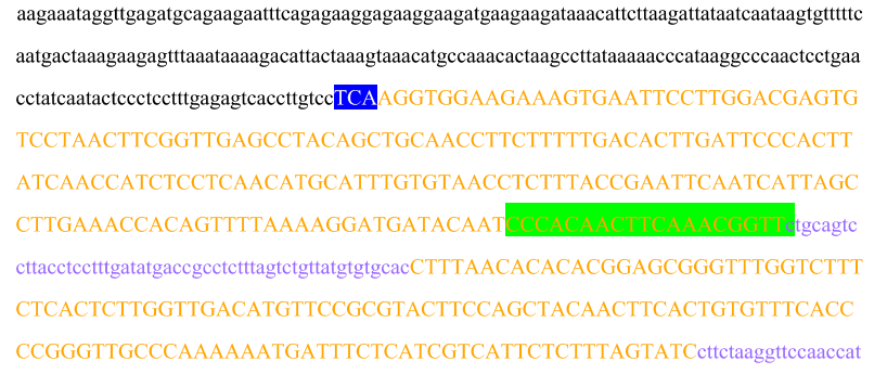 本实验选用的 Indel 分子标记位于 3 号染色体上,在生态型 Col 上有一个 121 bp 的插入序列,使用特异引物(位于插入位点上下游的单拷贝序列)扩增后,在 Col 和 Ler 两种生态型中的扩增条带大小分别为 511 bp 和 390 bp,序列信息示意图如下: