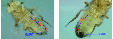 让学生用体视显微镜分别观察已经麻醉致死的不同果蝇品系对应的性状。特别要注意能准确鉴定果蝇的雌雄。通过性梳、尾部黑点和腹部体节(环纹数目)。