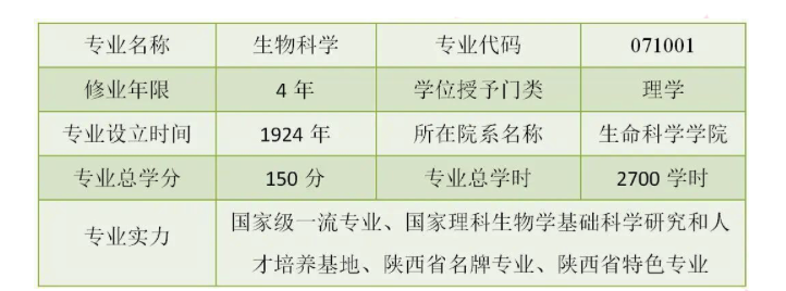 本专业获批为国家理科生物学基础科学研究和人才培养基地、陕西省名牌专业、 特色专业,2019年获首批“国家一流专业”。拥有植物学国家重点学科、西部生物资源与生物技术教育部重点实验室、国家级生物科学与生物技术实验教学示范中心等平台,以及“国家基础科学研究与人才培养基地(生物学)”。本专业拥有国家级生物科学与生物技术实验教学示范中心,主干课程本科教学实验室包括植物学 、植物生理学、动物学、动物生理学等,总面积约600平方米。依靠的学科平台包括西部资源生物与现代生物技术教育部重点实验室、陕西省秦岭珍稀濒危动物保育重点实验室、周至金丝猴研究基地、以及宁陕野外实习基地。