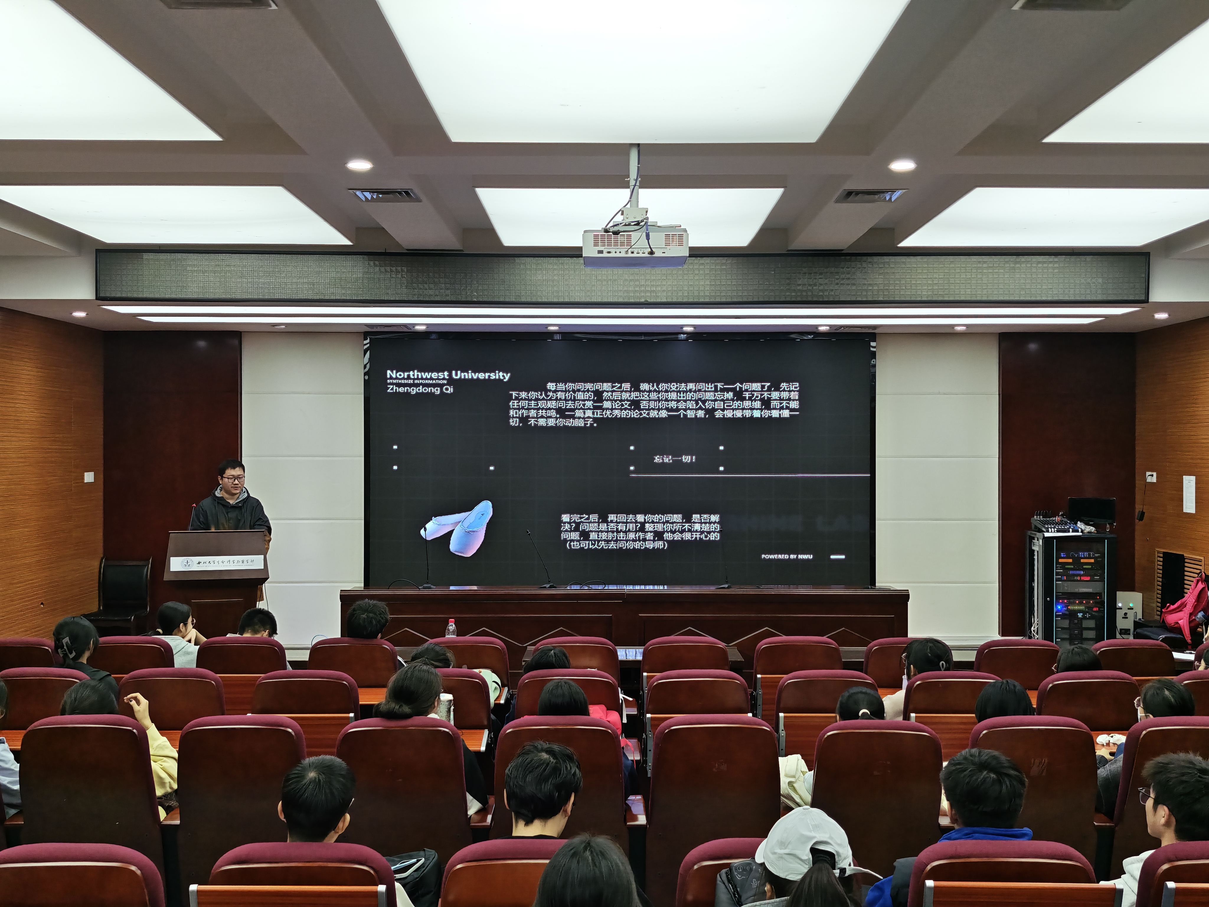 岂正冬同学系统阐述了做科研的准备工作,文献阅读方法和正确沟通方式。他将科研流程精炼为“找一个导师,读一些论文,要一堆任务,做一些事情”。他强调,大学中的机会要靠自己争取,同学们应多请教导师和学长学姐,积极参与竞赛和科研项目,丰富自己的经验,锻炼自己的技能。