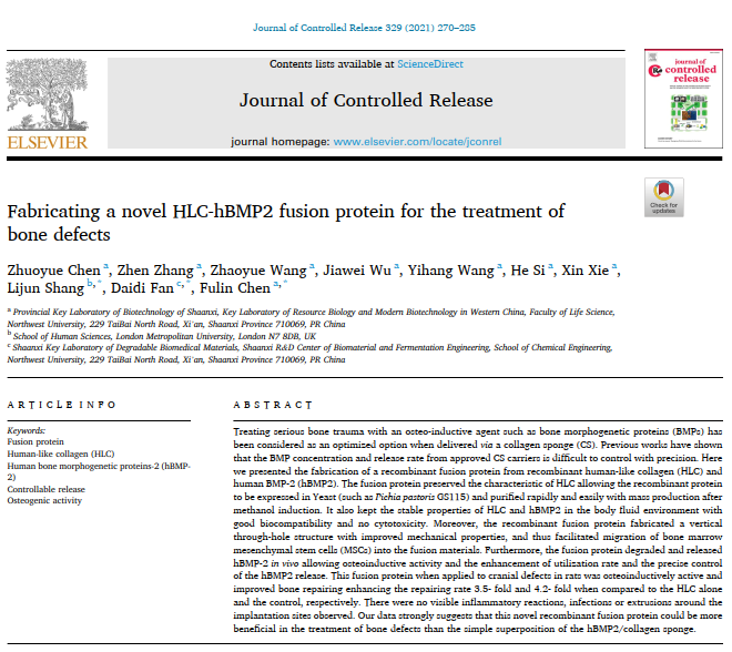 该研究成果以“Fabricating a novel HLC-hBMP2 fusion protein for the treatment of bone defects”为题,2021年1月10日在线发表于Journal of Controlled Release (医学一区Top期刊,IF 7.727 ) DOI:10.1016/j.jconrel.2020.11.058。该研究得到了国家自然科学基金、陕西省特支计划的资助。永利集团青年教师陈卓玥博士为论文第一作者,商立军教授,范代娣教授和陈富林教授为通讯作者。