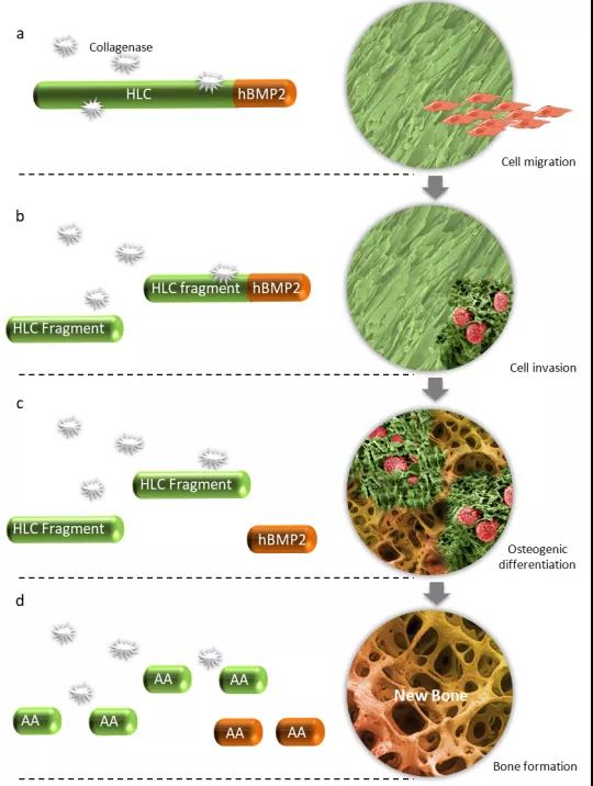 图2.伴随HLC-hBMP2缓释BMP2的骨形成过程示意图 (a) HLC-hBMP2的垂直通孔结构利于细胞向支架内部迁移; (b) 细胞迁移并定居在多孔支架之中,同时HLC-hBMP2在体内缓慢降解; (c) 随着HLC降解,hBMP2释放并形成二聚体,促进细胞向成骨细胞分化; (d) 新骨形成,HLC-hBMP2最终被酶降解为氨基酸(AA)。