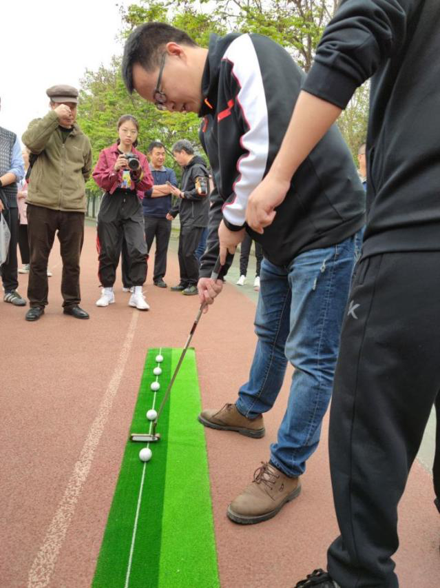 高尔夫击准是技巧与力量的比拼,精准度与方向感的较量,参赛老师稍加练习,从容上场,手起杆落,一挥进洞。