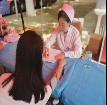 我院参与活动的志愿者们也是一道亮丽的风景线,他们以饱满地热情为大家服务。带领同学们登记并解释相关流程。在同学们献血过后,他们及时询问情况,为他们递上一份精美的小礼品,送上一份温情问候。