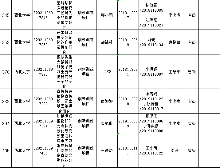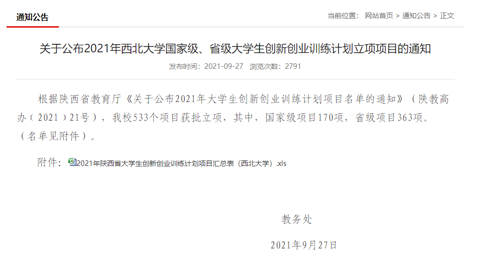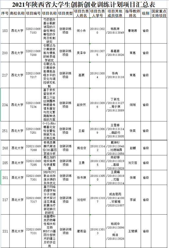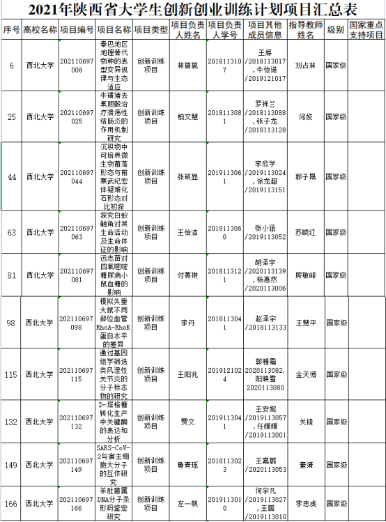 根据陕西省教育厅《关于公布2021年大学生创新创业训练计划项目名单的通知》(陕教高办﹝2021﹞21号),我校533个项目获批立项,其中,我院获批立项国家级项目10项,省级项目16项。