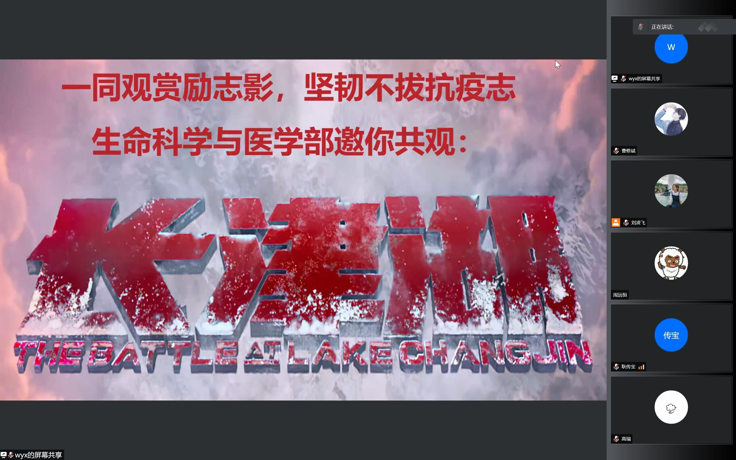 为进一步丰富疫情期间校园文化生活,厚植同学们的爱国情怀,培养同学们攻坚克难、逆行而上的英勇抗疫精神,3月18日晚,学部举办了“一同观赏励志影,坚韧不拔抗疫志”为主题的《长津湖》线上观影活动。太白校区全体学生参与了主题观影活动,线上热切交流,积极互动。