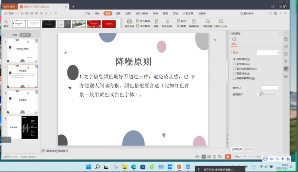 此外,王峰同学还向大家阐述了海报制作的两个主要原则,即降噪原则和对齐原则。降躁原则是指海报上的文字颜色信息不宜超过三种,以免整体显得凌乱;对齐原则是指文本信息应使其处于同一竖直线上,以显得格式整齐。这两个原则决定了海报的美观程度,有着很重要的意义。随后,同学们还对不明白的地方进行了提问,王峰同学也做了详细的回答和指导。