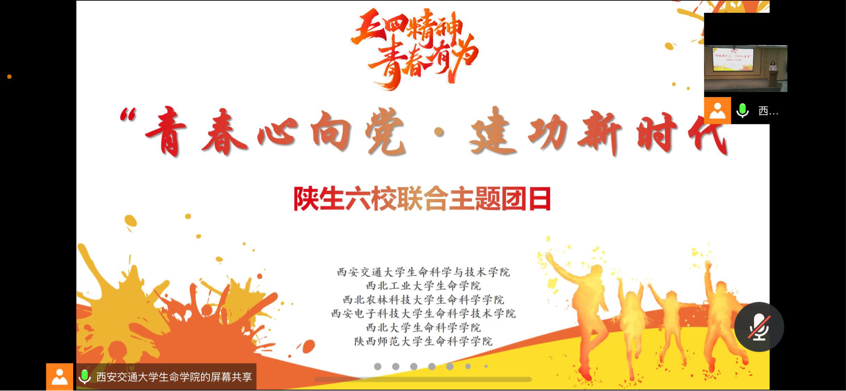 为庆祝中国共青团成立100周年,进一步传承和弘扬“五四”精神,充分展示新时代青年朝气蓬勃、昂扬向上的精神风貌,引领青年感悟奋斗精神,汲取奋进力量,4月29日,我院联合陕西六所“双一流”高校生命学院共同举办“青春心向党·建功新时代”主题团日活动。