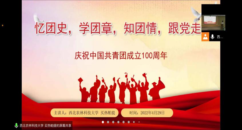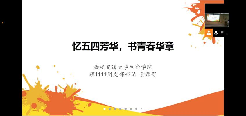 西安电子科技大学的刘雨薇同学以《青春志愿行 一起向未来》为题,叙说了志愿服务的特点,中国志愿服务的历程以及志愿服务的现状,展现了西电学子在志愿服务活动中的责任与担当。西北农林科技大学的买热帕提 • 买买提同学以《忆团史,学团章,知团情,跟党走》为题,通过讲述了团的发展历程,希望各位共青团员能坚定信念勇肩重任。西安交通大学的景彦舒同学最后以《忆五四芳华,书青春华章》为题,讲述了一代又一代的交大青年始终践行着党和国家、民族和人民“同呼吸共命运”的誓言,听党指挥,跟党走。