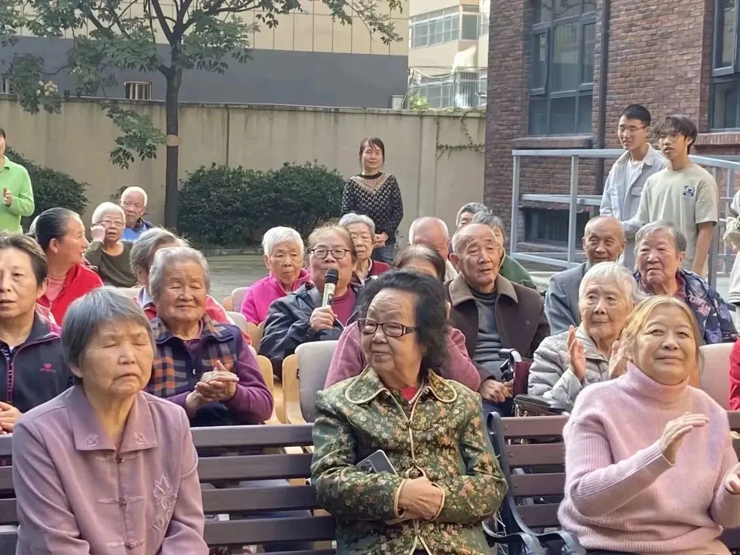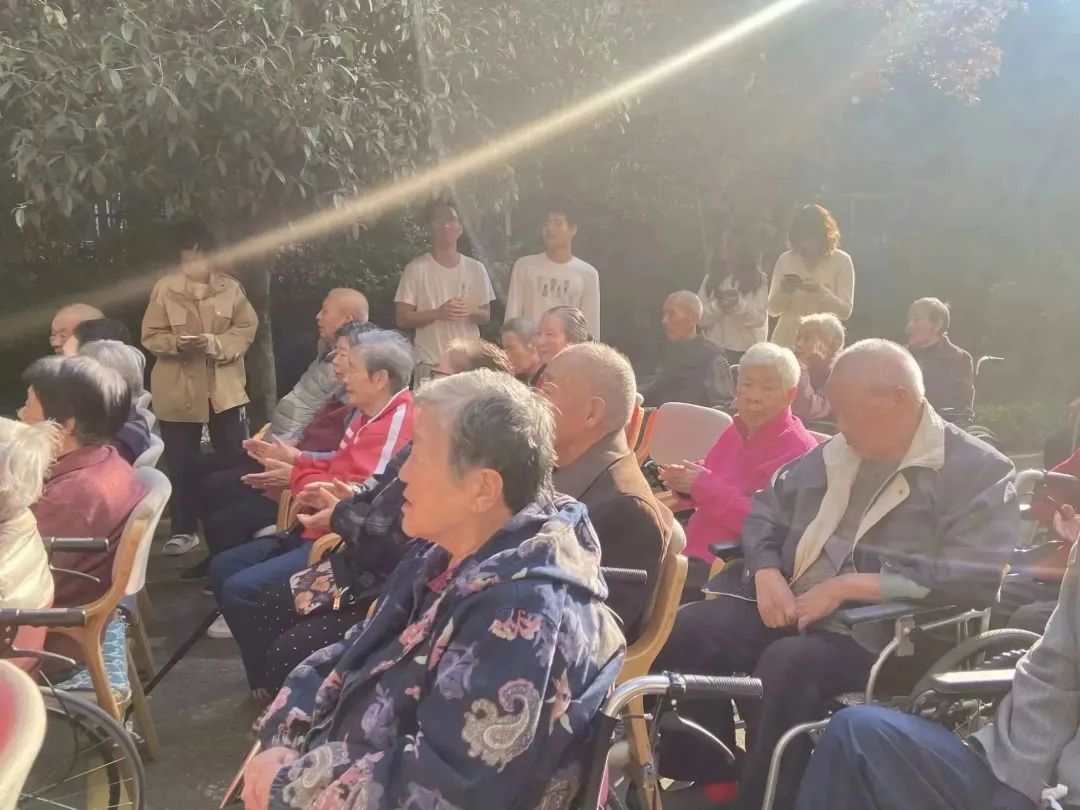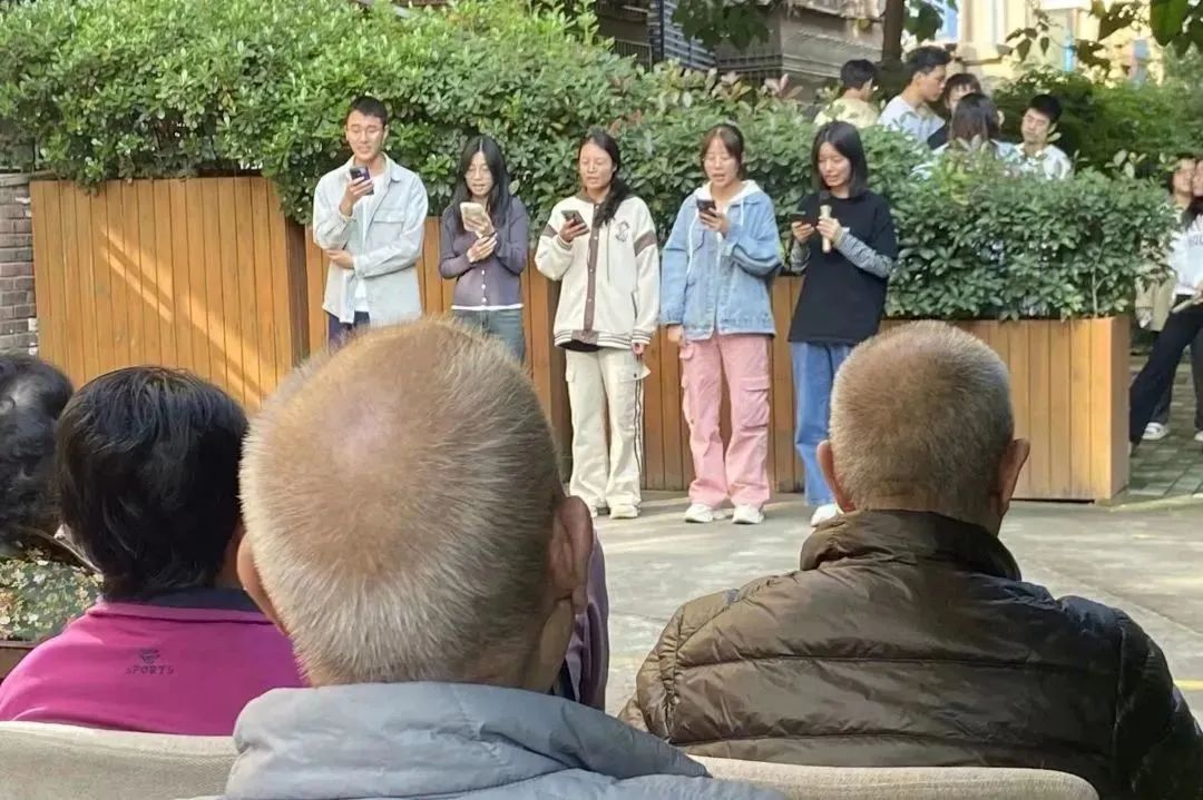 在养护院绿意盎然的院落里,同学们为老人们演唱《我和我的祖国》、《老男孩》等歌曲,老人们听得津津有味,亲切动人的歌声唤起了老人们的爱国情怀和澎湃热情,他们也像个孩子一样积极投入到表演中,与我们共同歌唱了《东方红》、《打归来》和《没有共产党就没有新中国》等歌曲。