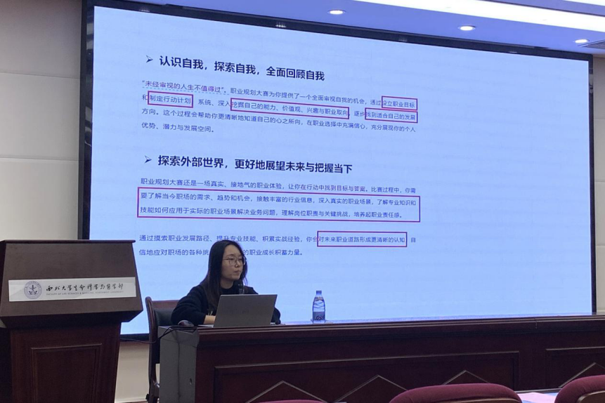 随后,学校首届大学生职业规划大赛成长赛道金奖得主,学院2022级本科生胡悦洋同学,就业赛道金奖得主,地质学系2022级硕士研究生王姝慧同学分别向与会同学作参赛经验分享。两位同学先后向大家展示了各自的参赛材料,着重围绕决赛PPT讲解了她们的作品思路、材料脉络与存在的不足,分享了在备赛过程中的心得体会和参赛收获,鼓励同学们在网络上自主搜索首届大赛的省赛、国赛资料,进一步完善参赛材料,以此为在场学生提供了宝贵的实战经验。