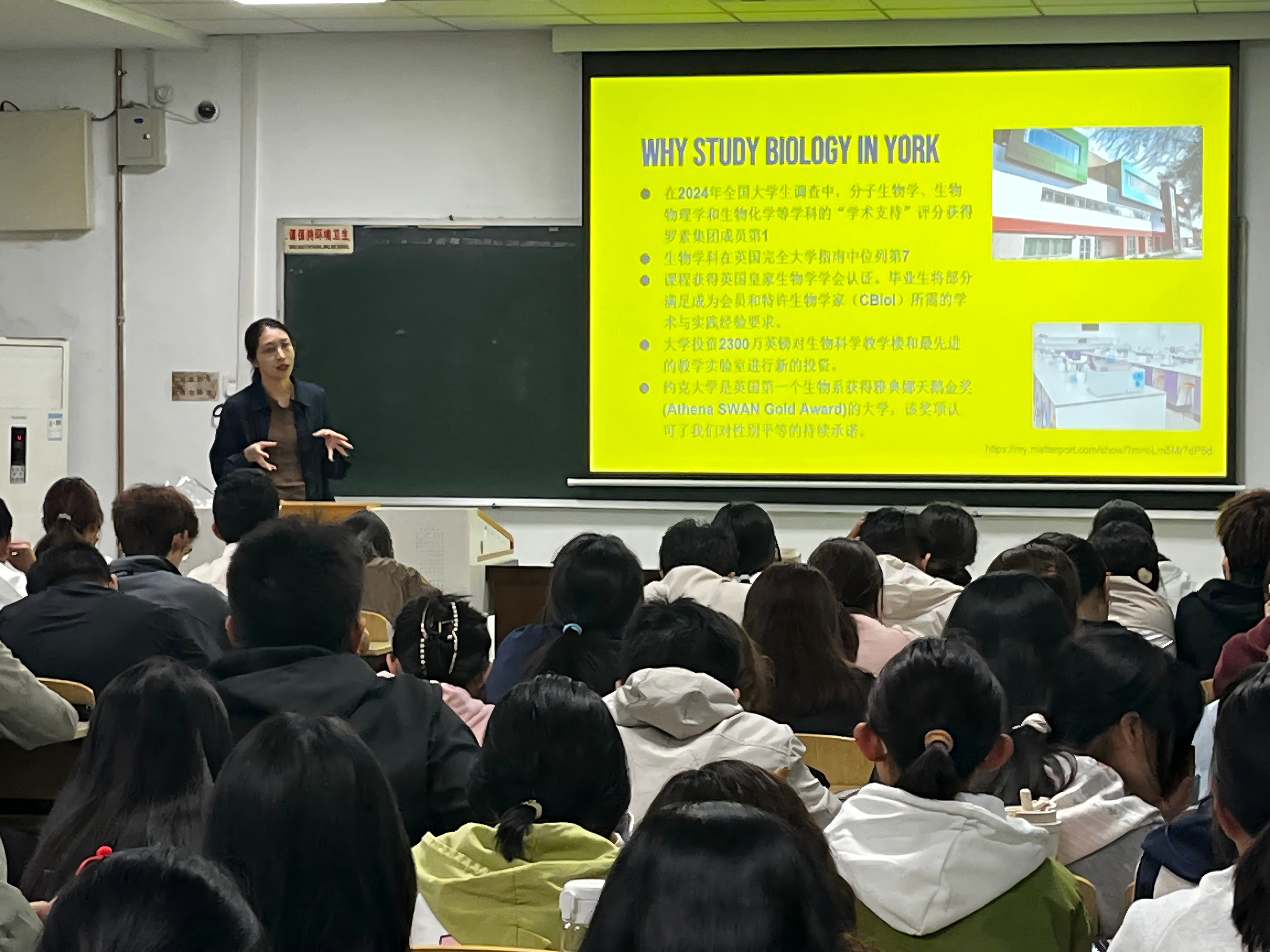 为助力2025级新生了解学院与英国约克大学本科“2+2”联合培养项目,引导学生尽早明晰成长规划,解锁国际化学业路径,2025年9月18日下午,学院于太白校区7501教室举办“留学有方,逐梦世界”约克大学“2+2”联合培养项目宣讲会。约克大学中国合作伙伴官员冯海玥老师主讲,大一全体生物类本科生参加。活动由就业专干郭佳惠老师主持。