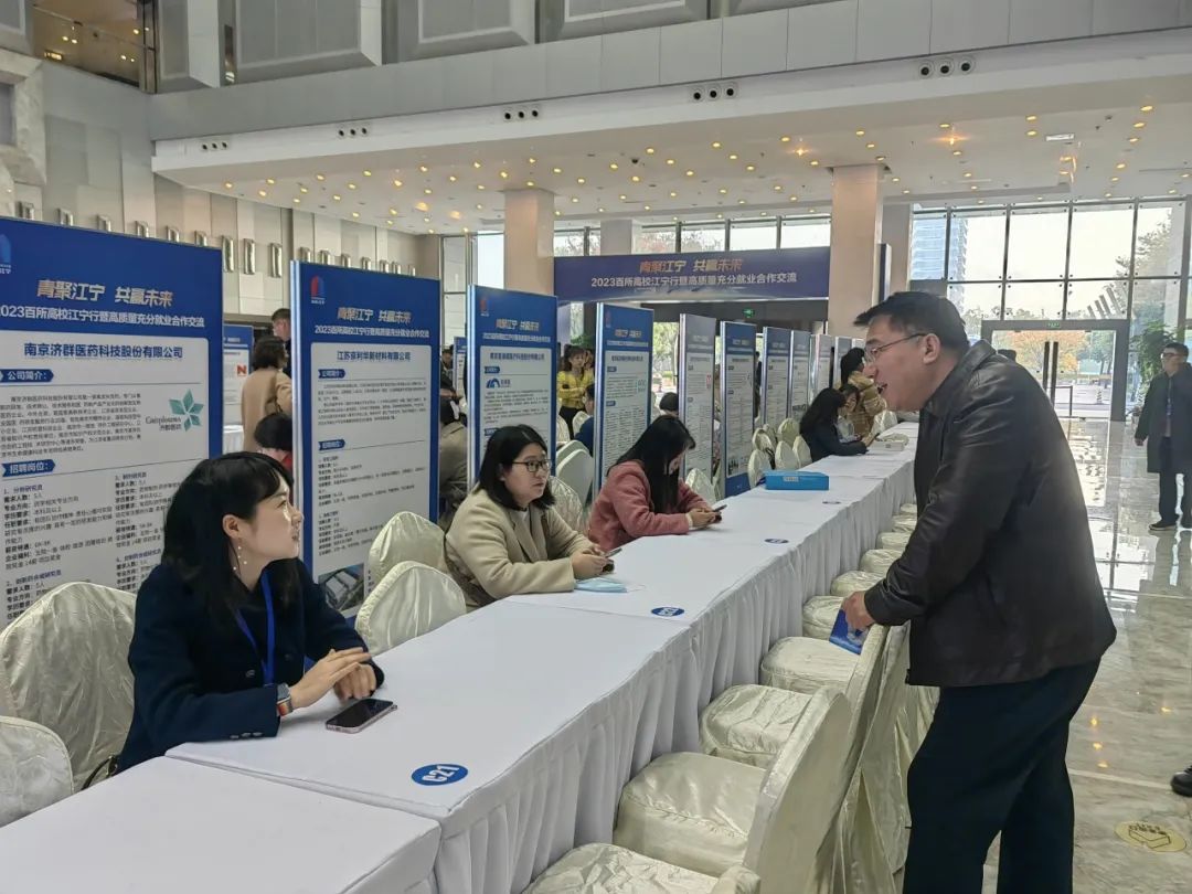 11月23日,一行共赴南京市江宁区,参加“青聚江宁 共赢未来”2023百所高校江宁行暨高质量充分就业合作论坛活动,活动由南京市江宁区人民政府、南京市人力资源和社会保障局联合举办,江宁地区300余家企业和全国各地100余所高校参加。活动开幕式上,江宁区负责人从经济总量、人才布局、产业集群、人才引进政策等方面介绍了江宁区的发展优势,播放了江宁建设的相关宣传片,推介了江宁区的毕业生就业创业环境。江宁区高质量充分就业合作对接会与平行交流专场上,魏宁等人先后与南京金斯瑞生物科技有限公司、南京擎科生物科技有限公司、南京济群医药科技股份有限公司、江苏九州通医药有限公司等业内单位现场交流,询问了公司的基本情况、岗位设置与招聘计划,积极介绍了学校的学科布局与综合地位,推荐了2024届毕业生。