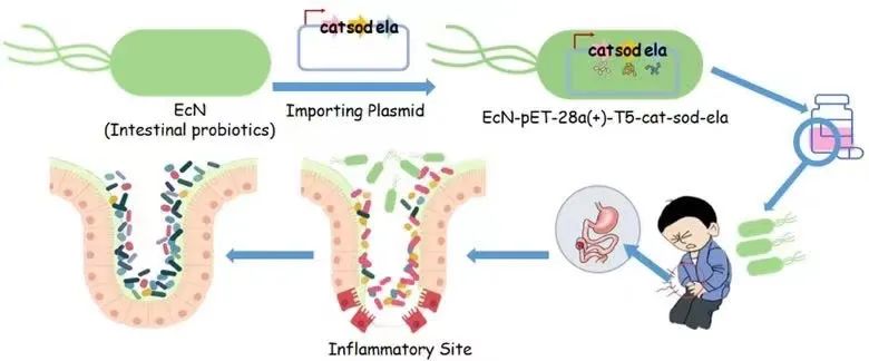 基于上述两套酶的作用,项目团队设计了质粒EcN-pET-28a(+)-T5-cat-sod-ela,并将其导入益生菌EcN,可同时满足降低ROS和抑制蛋白酶活性从而治疗IBD。