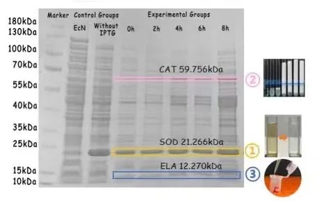 项目团队已经成功构建了该质粒,并且在EcN中成功表达。为了检测三种酶的活性,他们使用了三组模型。分别是邻苯三酚法检测SOD活性、氧气柱法检测CAT活性和蛋清法检测Elafin活性。该实验非常成功,实验结果证明,该项目团队表达出了高活性的蛋白。